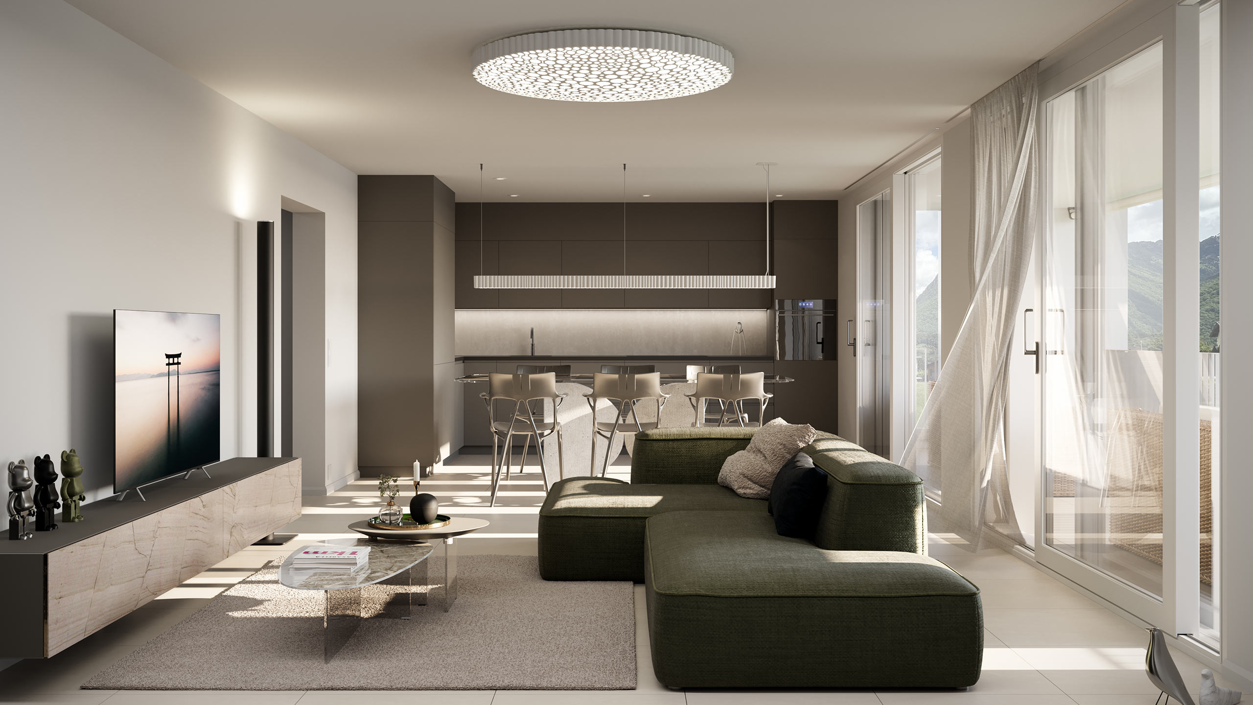 I materiali scelti per i rivestimenti esterni contribuiscono a creare un’architettura sobria, contemporanea ma mai invasiva. Le ampie superfici vetrate, oltre a garantire luminosità agli ambienti interni, permettono un dialogo costante con il paesaggio, valorizzando la vista panoramica sulle Alpi Ticinesi e offrendo una sensazione di continuità tra interno ed esterno.